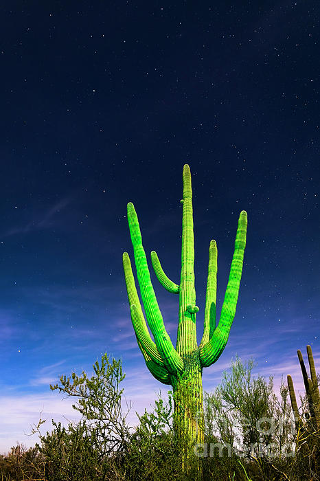 A green saguaro cactus (light painted) is highlighted against a star-filled sky in Saguaro National Park, Tucson, Arizona. Located about 6.5 hours... more